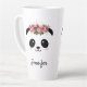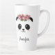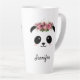 Coroa floral panda bonita personalizada caneca latta. Bonito rosto de kawaii panda chubby com bochechas cor-de-rosa e coroa floral. Adicione facilmente seu nome para personalizar a caneca. Um belo presente para uma garota, uma filha, namorada de aniversário ou outra ocasião especial. Duas imagens laterais, em cada lado da caneca.
