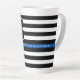 Mostre o seu apoio com esta caneca de latte americana, linha azul e fina. Este design apresenta uma bandeira branca e preta com uma linha azul fina com um nome e um local de trabalho para você personalizar. O presente perfeito para a família e amigos que são policiais e polícias. Concebido pelo artista mundialmente famoso ©Tim Coffey.