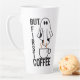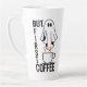 Mas primeiro, café. Então... Esta imagem apresenta uma design divertida e caprichosa com a frase "MAS PRIMEIRO CAFÉ" escrita verticalmente no lado esquerdo. O texto está em negrito, angustiado, adicionando um encanto rústico. À direita do texto, há uma bela ilustração fantasma pairando sobre uma xícara de café a vapor. O fantasma parece desfrutar do aroma do café, com linhas de vapor ascensões da xícara, sugerindo uma bebida quente e convidativa. Esta imagem combina inteligentemente um tema assustador do Dia das Bruxas com uma rotina matinal relativa, fazer divertido e relevante para amantes do café que apreciam um pouco de humor. ☕ 👻