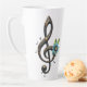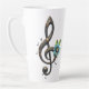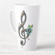Mechanical clef and flowers to the beat of the clocks. A steampunk-style treble clef, rendered in dark metal with bronze accents and intricate detailing. The clef is adorned with blue flowers that have clock faces at their centers, adding a whimsical touch. Musical notes float near the clef, and small droplets hang from its curves.