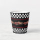 Aqui está uma caneca de na moda latte que estrela uma Corvette vermelha. Colocado sobre um fundo preto, este design tem uma borda em branco e preto na parte superior e inferior da caneca. No centro, há uma fileira da mesma imagem Corvette.