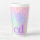 Um fundo holográfico de tendência com cores pastel unicórnio e arco-íris cor rosa, púrpura, rosa, verde de menta. Decorado com pingos de brilho falso em ouro rosa, rosa e roxo. Personalize e adicione suas iniciais de monograma. Letras cor roxa a negrito. Um pouco de brilho do dia a dia para iluminar seu dia!