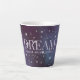 Uma caneca tardia com as palavras inspiradoras "sonhar, imaginar, acreditar, criar" em letras maiúsculas violetas pastéis contra um céu noturno estrelado em meio a violeta empoeirada e nuvens espaciais da nebulosa azul. Mística e mágica como o misterioso reino dos sonhos. Use o modelo de texto para adicionar um nome, fortalecendo palavras ou aspas inspiradoras. ♡ Idyllfire