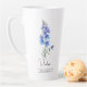 Flor do mês de nascimento Julho Larkspur caneca latte com ilustração de uma flor de larkspur. Abaixo da flor, o nome é escrito em uma fonte na moda. Abaixo do nome, ele diz "Julho - Larkspur", indicando que o mês de nascimento do dono é julho e que sua flor de nascimento é o larkspur. É uma caneca personalizada, criada como um presente pensativo para alguém nascer em julho.