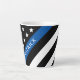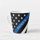 Mostre o seu apoio com esta fina caneca latte de bandeira azul da polícia. Este design apresenta uma bandeira negra e branca da polícia com linha azul fina a um ângulo e um nome para você personalizar. Concebido pelo artista mundialmente famoso ©Tim Coffey.