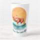 A adorável caneca latta "vibes de verão" apresenta design de aquarela de arte digital de um urso marrom giro giro flutuando pelo rio com texto "vivendo a vida do rio"