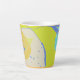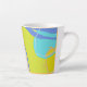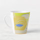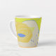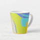 Esta caneca latta apresenta formas desenhadas à mão, planas, orgânicas e frutas, em cores azuis, amarelas, brancas e laranja.
