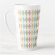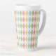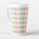 A caneca de leite moderna e na moda tem um padrão pastel de diamante argyle em fundo branco.