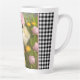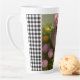 Bonito caneca latte apresenta uma pintura digital de um pintinho bebê entre flores cor-de-rosa e amarela com fundo de verificação de gingham preto e branco.