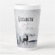 Uma caneca latta com uma imagem aquosa que apresenta uma rena preta de silhueta, entre alguns pinheiros. Esquema de cor neutra a preto e branco.