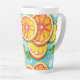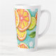 Esta grande caneca de latte exibe um vibrante design cítrico com suculentas fatias de laranja, limão e lima ilustradas em um estilo moderno e animado. Contra um fundo azul-turquesa brilhante com acentos dinâmicos de respingos e folhas verdes frescas, a arte cria uma aparência energizante e refrescante que ilumina todo ritual matinal. Com sua forma alta e elegante e capacidade generosa, esta caneca é perfeita para lattes, cappuccinos, chá, cacau ou bebidas noturnas aconchegantes. Durável, brilhante e cheia de personalidade, ela traz um surto de cor para as rotinas diárias e faz um presente alegre e memorável para amantes de frutas e fãs de design inspirador.