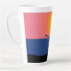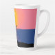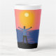 Saudação ao Sol. Um homem está parado numa praia virada para o mar aberto e saudando o sol amarelo com braços levantados.
