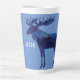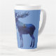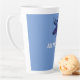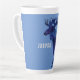 A caneca latina apresenta silhueta de alça aquática com preenchimento celeste e texto personalizável sobre fundo azul claro