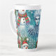 Um design de caneca de latte, cúmplice, com Jack Frost e um bonitinho bonitão. Jack Frost é ilustrado com tons azuis gelados, padrões de geada e sotaques de floco de neve, enquanto o boneco de neve tem um cachecol confortável, nariz de cenoura, e um chapéu de topo. O fundo mostra uma cena de inverno nevada com gradientes suaves e gelados e estrelas cintilantes. Perfeito para tomar bebidas quentes durante a época festiva!