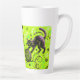 Bold two-tone latte mug featuring a playful black cat with a yarn ball, drawn in a quirky doodle style on a vivid neon green side and a warm orange side. This colorful cat art mug stands out instantly and brings fun, creative energy to every drink.