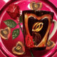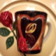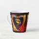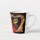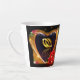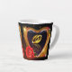 Linda caneca de latte com uma imagem impressa de uma pintura em acrílico de dois anéis de casamento dourados dentro de um coração dourado em forma com uma rosa vermelha.