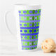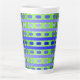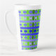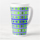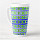 Esta caneca tem um design geométrico de linhas em tons azuis e verdes tecidos para fazer uma xadrez.