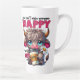A funny, sarcastic, and colorful design showcases an adorable highland cow with big blue eyes, brown fur, and a sad expression, holding a steaming cup of coffee and a daisy. The vibrant text reads, "You can't make everyone happy, you are not coffee." This charming design is available on a variety of products, making it a perfect gift for coffee lovers.