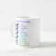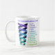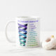 This mug features a rainbow sprial of energy, representing Abraham-Hicks concept of the emotional guidance scale. All along the scale, in a rainbow serif font, are all the emotions on the scale: Love, Passion, Happiness, Positive Expectation, Optimism, Hopefulness, Contentment, Boredom, Pessimism, Frustration, Overwhelment, Disappointment, Doubt, Worry, Blame, Discouragement, Anger, Revenge, Rage, Jealousy, Guilt, and Fear. Art is on a white background.