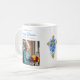 Uma linda caneca de café comemorativa para funerais, celebração de encontros da vida ou para enviar a amigos e familiares em homenagem a alguém que perderam. Você pode adicionar uma foto na área personalizada. A parte de trás tem um poema religioso para conforto para lembrá-lo de que seu ente querido está nos braços de Deus agora. As cores de destaque usadas são azul e dourado. Há também uma cruz dourada com flores azuis.