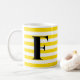 Letra F Mug com traços positivos começando com F contra listras amarelas.