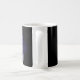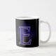 Mok met de letter E. (bijvoorbeeld je initiaal) Leuk als je naam met de E begint of die van een ander. Achter de letter is een raster en mysterieuze wolken met een licht die erop schijnt. De letter E is gevuld met een plaid patroon en een grijze rand erom heen. kleuren blauw, paars, geel en zwart.