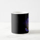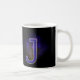 Mok met de letter J. (bijvoorbeeld je initiaal) Leuk als je naam met de J begint of die van een ander. Achter de letter is een raster en mysterieuze wolken met een licht die erop schijnt. De letter J is gevuld met een plaid patroon en een grijze rand erom heen. kleuren blauw, paars, geel en zwart.