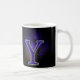 Mok met de letter Y. (bijvoorbeeld je initiaal) Leuk als je naam met de Y begint of die van een ander. Achter de letter is een raster en mysterieuze wolken met een licht die erop schijnt. De letter Y is gevuld met een plaid patroon en een grijze rand erom heen. kleuren blauw, paars, geel en zwart.