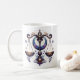 Esta caneca na moda apresenta uma brilhante representação aquosa do símbolo astrológico de Libra numa elegante combinação de preto, azul, roxo, ouro e marfim. Comece escolhendo seu estilo de caneca. Opte por branco clássico ou adicione um dentro de cor complementar à caneca ou na alça. O design inclui o nome do destinatário e destaca os principais traços de personalidade desse sinal. Usando a caixa Editar design à direita, você pode personalizar o nome, mudar a fonte ou adicionar uma frase ou citação favorita, de forma fácil e rápida.