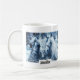 Uma caneca com uma fotografia de um par de cavalos amarrados juntos. Um dia de neve e um filtro azul criam uma cena mágica.