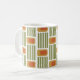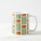 Esta caneca tem um design moderno século médio feito de cinco linhas verdes e um retângulo dourado arredondado com um retângulo laranja arredondado repetido na design.