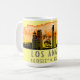 A caneca do café apresenta silhueta do horizonte da cidade de Los Angeles, Califórnia, com abertura de cor d'água e coordenadas de latitude e longitude em fundo amarelo pálido.