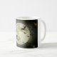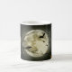 Imagem temática de Halloween e gótica. Uma grande lua de cheio à noite com morcegos voando e um corvo sentado no galho de uma árvore cagada.