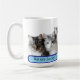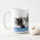 Enjoy your morning coffee with this funny tabby lucky cats' photo mug, a gift dedicated to a cat lover, humor quote in a blue rectangle round corners shape, cats' photo is generative content. Customize the photo with your own cat's one, using the Replace Background in Edit options