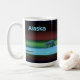 Um urso polar vagueia o gelo durante a longa noite polar; o Norte brilha em vermelho e verde à distância. A leitura de texto "Alaska" em azul e branco brilhantes também é exibida.