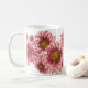 Esta linda caneca decorativa apresenta um doce crisântemo rosa. As cores pétais variam de uma pincelada pálida a uma magenta profunda em direção ao centro. Os próprios centros são verdes e amarelos.