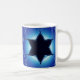 Uma simples imagem fractal, de tom azul, de múltiplas instâncias de um Magen David (Estrela de David) formada pela interseção de linhas de vidro ou cristal, a estrela central é cheia de azul escuro. Personalize adicionando seu próprio texto no lado oposto.