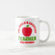 Professora personalizada apreciando caneca de café com uma maçã vermelha aquosa com folha verde, o ditado bonitinho "o maior professor do mundo", e seu nome.