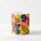 Esta caneca tem um design de uma pilha de folhas em verde, amarelo, laranja, azul, marrom e vermelho em um campo de amarelo pálido.