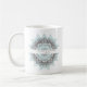 Um padrão de mandala legado em um gradiente de azul-ovo e cinza quente do soft robin junto com texto de script fluindo dá a esta elegante suíte de casamento que é luxuoso. A caneca de café cerâmica mostrada aqui permite que você edite facilmente os nomes da noiva e do noivo e a data do casamento usando o modelo fornecido. Procure ID968 para ver todas as peças correspondentes neste belo conjunto de casamento.