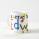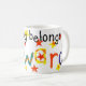 Uma caneca branca com a inscrição "Esta caneca pertence a Edward" em letras coloridas feitas de colagem de papel pintada à mão.