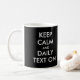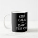 Comece seu dia com encorajamento usando esta caneca "Manter Calmo e Texto Diário Ativado"! É totalmente personalizável, para que você possa personalizar o idioma, as cores e o estilo de texto para corresponder à sua preferência.