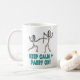 Mantenha a Cerca Calma mostra dois esgrimistas duelantes acima de um trocadilho humorístico "Mantenha Calma e Parry On!".