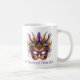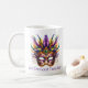 This ceramic coffee mug is shown with Mardi Gras images, Text of "Let the good times roll' is beneath the prints.