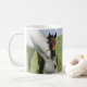 Fotografia de uma cinza está pastando com um potro de baía ao lado dela, preso no pescoço. Imagem impressa em ambos os lados da caneca.