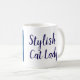 Caneca branca impressa com um azulejo de gato azul-alivio marinho inspirado nos azulejos de Art Nouveau e nas palavras "Senhora de gato Na moda". O texto é totalmente editável.