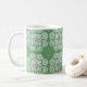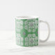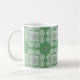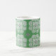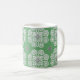 Caneca de café na design de Scroll Medallion. Fundo verde médio, com um impressão de medalhão de rolagem branco de repetição. Cinzas e detalhes em preto. Base branca, alça e interior.