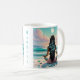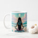 Linda arte ai retratando uma linda mulher meditando na praia com pina e nuvens azuis, ondas oceânicas, areia branca e vidro marinho.