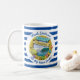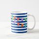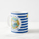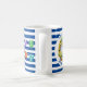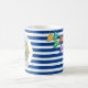 Uma fabulosa caneca de protetor de onda azul listrada e grande, ideal para adicionar o nome do seu filho e uma mensagem especial. No verso há um beliche de celebração, uma caneca ideal à beira-mar para sua casa de férias, ou um presente de encorajamento.