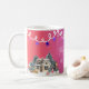 This festive Christmas mug features the cheerful message “Merry Christmas” alongside a charming illustration of a small Christmas town and a friendly snowman’s face. Designed in a soft blend of pink, purple, and hints of red, it brings a cozy yet playful holiday vibe. Perfect for enjoying hot chocolate, coffee, or tea, this mug makes a sweet and thoughtful Christmas gift or a cute seasonal keepsake.
